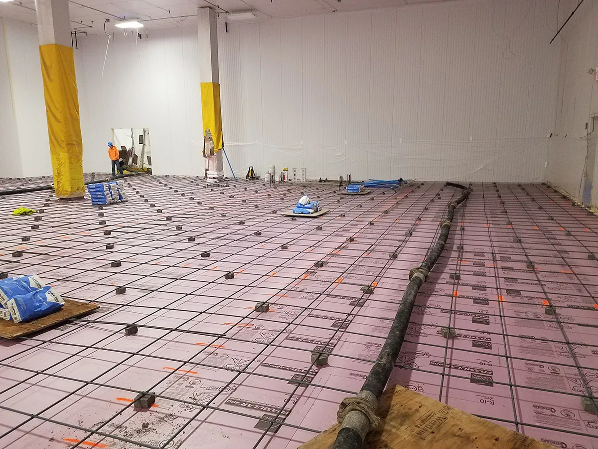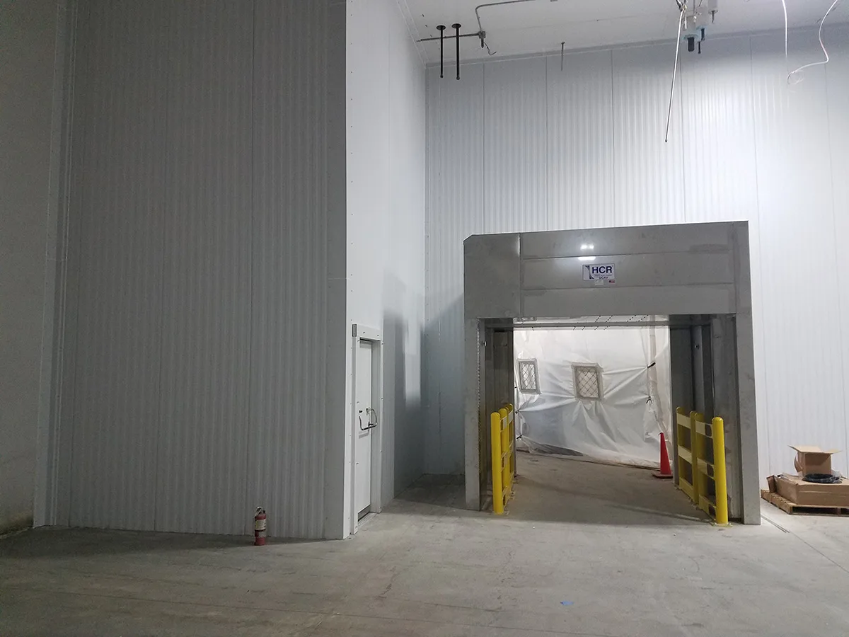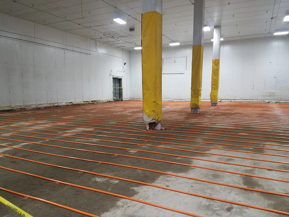 After the existing freezer at this facility failed, our team was brought in to remodel. We tore down the existing wall and replaced it with a new insulated metal panel. We also tore out the existing slab and insulation, and our team replaced the glycol heat system.